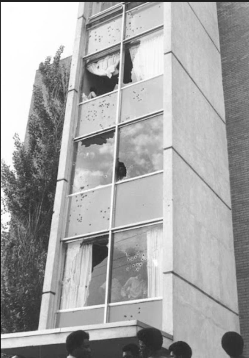 On May 14, 1970, a critical event occurred when somebody set a dump truck on fire in the middle of the street. This incident caused many students to leave their dormitories. Alexander Hall, which used to be an all-women's dormitory, was situated right next to the street on a hill. As a result, many students gathered there, having a good time and laughing. The fire department was called to put out the fire, but they weren't the only ones who showed up. Members of the Jackson police, state highway patrol officers, and national guardsmen appeared, dressed entirely in riot gear, and marched up Lynch Street. Eventually, they stopped right in front of Alexander Hall. They also brought the "Thompson Tank," which was a fully armored personnel carrier purchased by Allen Thompson, the segregationist mayor of Jackson, ahead of what he termed the “invasion” of civil rights activists during Freedom Summer in 1964. According to The Nation.com, The highway patrolmen carried state-issued shotguns and double-aught buckshot, personal weapons, and even “two 9mm submachine guns.” Whether it was a sniper being spotted on the 5th floor or the fact that someone threw a glass bottle at the police, all hell broke loose, and for 28 seconds, the officers let off 400 rounds of ammunition, wounding several students and killing Philip Gibbs and James Earl Green.