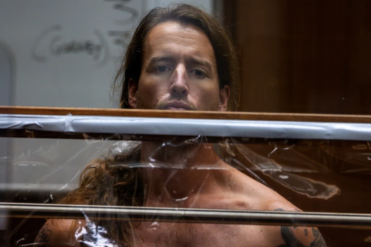 While awaiting sentencing, he makes two strange appearances in court... shirtless